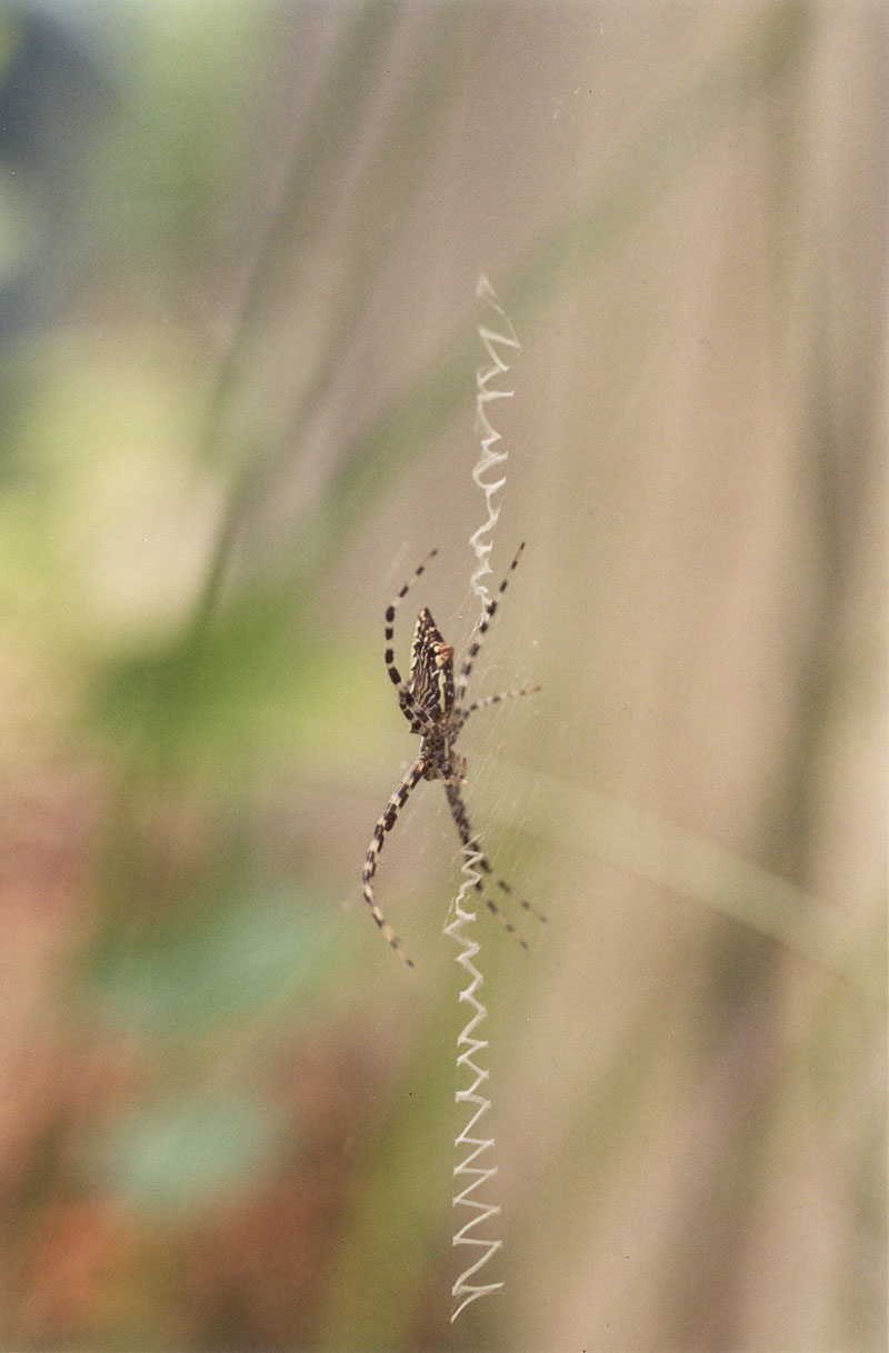 Argiope aurantia - (female) - same spider as in above photo. After being startled, she scurried to the safety of the web's edge.